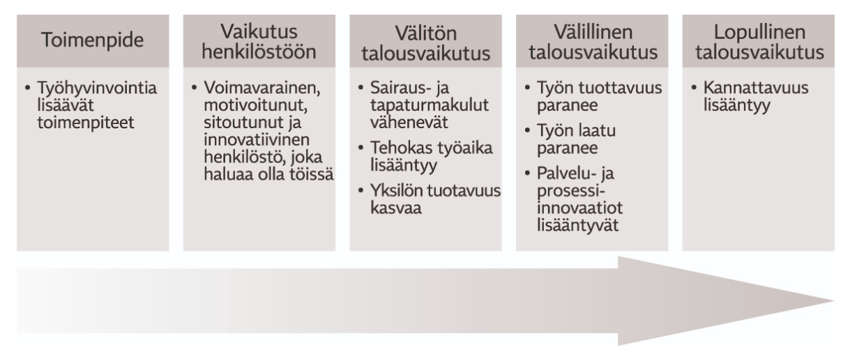 Työhyvinvoinnin puutteesta sen sijaan voi tulla yritykselle huomattava kuluerä. Jos organisaatiossa työntekijät eivät tunnista omaa rooliaan tai työnsä päämäärää, sitoutuminen ja jaksaminen on vaikeaa, jolloin töiden sujuvuus, laatu ja tuloksellisuus heikkenevät. Suoria kustannuksia tulee poissaoloista ja työterveyshuollon sairauskäynneistä johtuvista kuluista, tapaturmista, varhaisesta eläköitymisestä, henkilöstön vaihtuvuudesta ja osaamisen poistumisesta yrityksestä. Motivaatio-ongelmat johtavat huonoon työilmapiiriin, joka vaikuttaa negatiivisesti myös työyhteisön toimivuuteen ja sitä kautta yrityksen talouteen. (Joki, 2021, s.151)